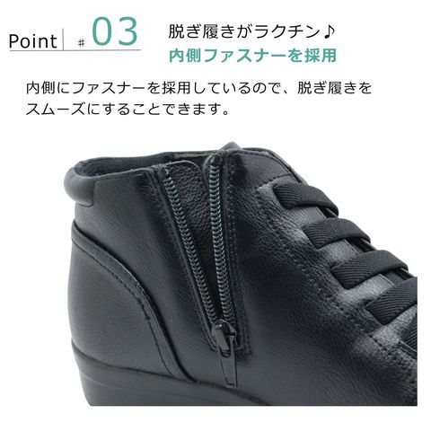 サイドにはファスナーを採用しているので脱ぎ履きも楽々です。