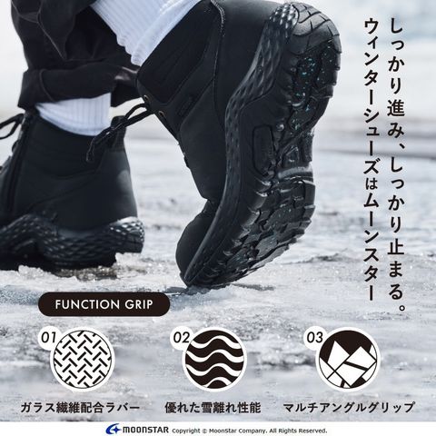 「4cm4時間防水」機能と、凍った路面でも高いグリップ性能を発揮する「ファンクショングリップ」ソールの搭載で、ウィンターシーズンを快適にサポートします。