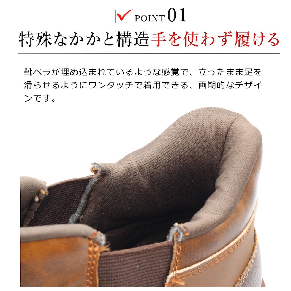 靴ベラの様なカカトの形状により、手を使わずに驚くほどスムーズに脱ぎ履きが可能です。