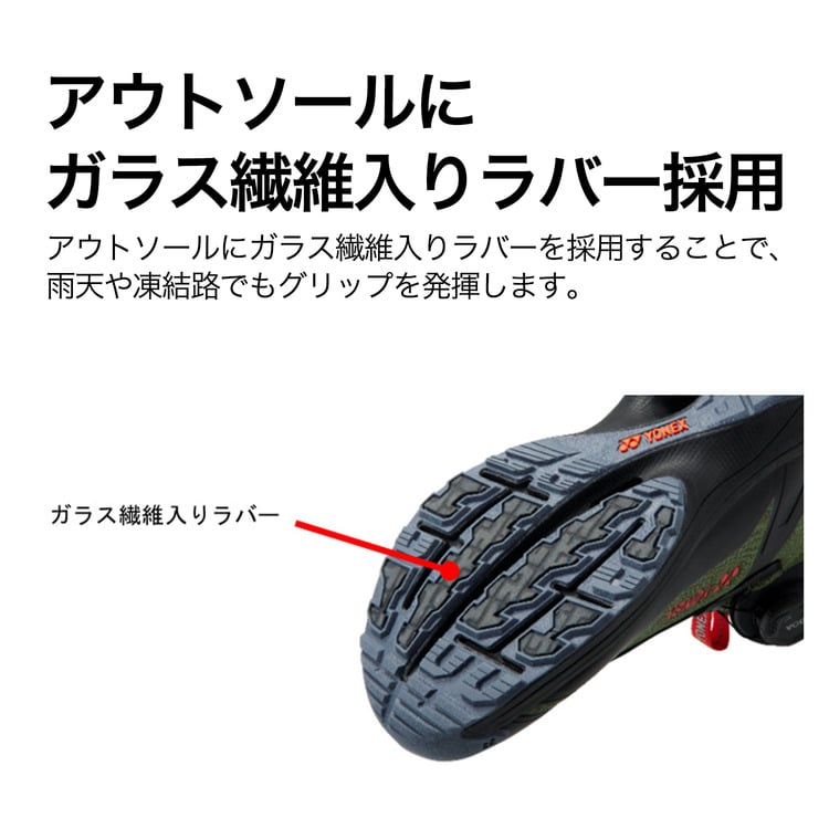 アウトソールにはガラス繊維入りラバーを採用し、濡れた路面や凍結路でも高いグリップ力を発揮します。