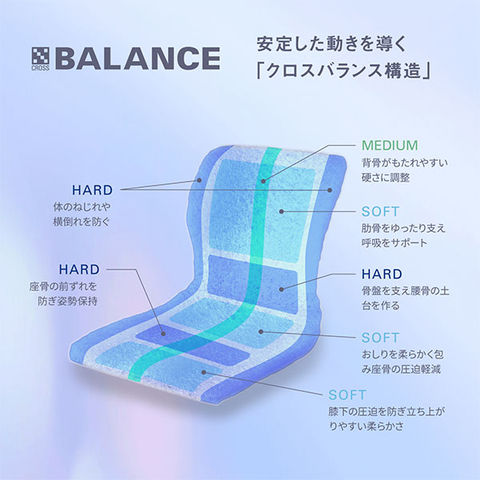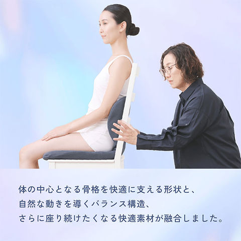 座るだけで、無理なく自然と正しい姿勢に導いてくれる。こころもからだも、のびのびできるクッションです。