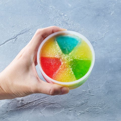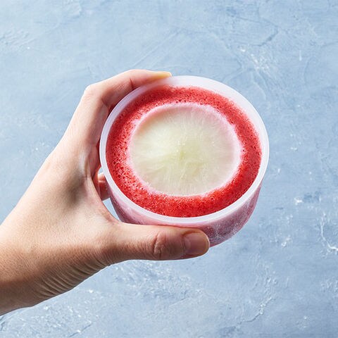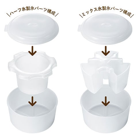 「ハーフ氷」と「ミックス氷」に対応した製氷カップが付属。作り方も簡単で、カップにジュースを入れ、製氷パーツをセットして一度目の冷凍。固まったら製氷パーツを取り外し、空洞部分に別のジュースを入れて再度冷凍。しっかり固まれば、削るだけで見た目も味も楽しめる2色氷のできあがり!
