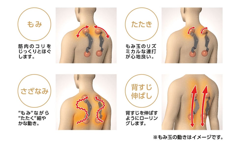 4つのもみ玉が、首すじからお尻まで広い範囲をしっかりとマッサージ。肩、背中、腰といったそれぞれの部位ごとに、きめ細やかに強さを調節できるため、あなたの好みや体の状態に合わせて、まるでオーダーメイド感覚の心地よさを味わえます。