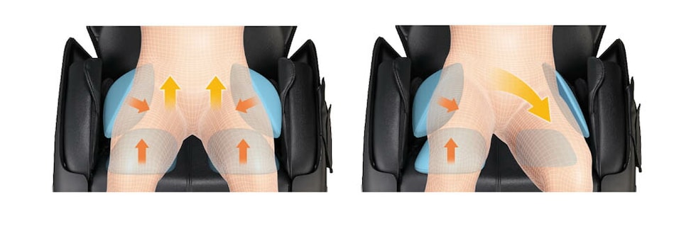 長時間の座り姿勢などで凝り固まった骨盤まわりの筋肉を、やさしく包み込むようにホールド。下からしっかりと持ち上げながら心地よく圧迫し、さらに左右にひねるようなマッサージで、溜まった疲れやこわばりをじっくりと解きほぐします。まるでプロの手技を受けているような、深いリフレッシュ感をご体感いただけます。