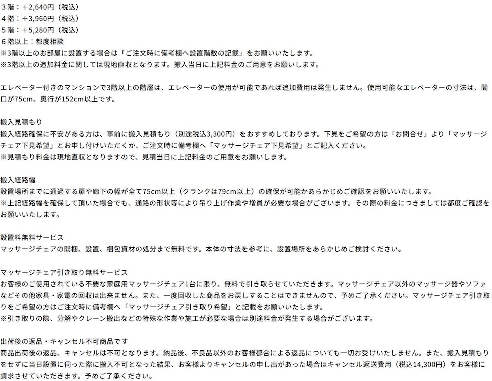 送料、設置料は無料(2階まで)。しかも不要になったマッサージチェアも1台まで無料でお引き取りし、ご希望の場所へ設置します。ご自宅のマッサージチェアの買い替えはもちろん、ご両親へのプレゼントにもおすすめです。