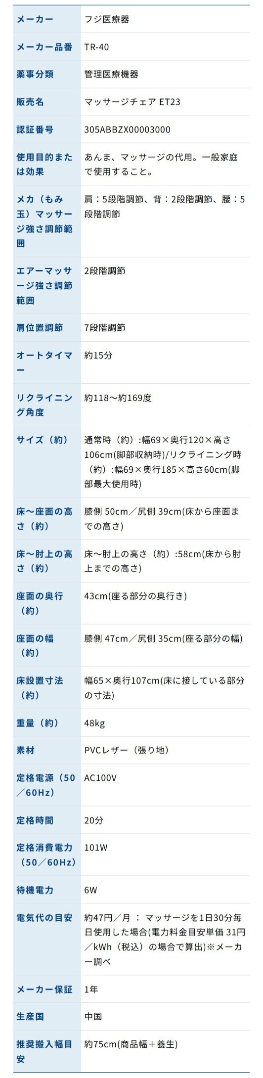 フジ医療器 マッサージチェア ET23 TR-40 TR-40 1台