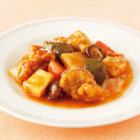 ケチャップベースの甘酢ソースで仕上げました。
