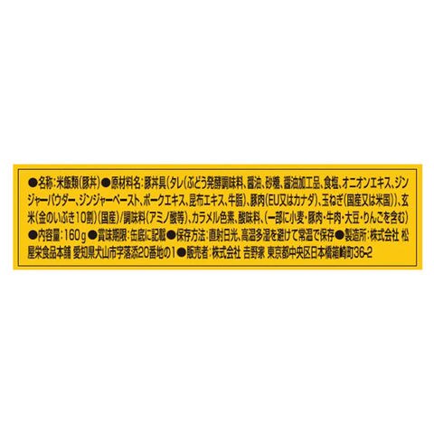 原材料:玄米(国産金のいぶき)、豚肉、タレ(ぶどう発酵調味料、醤油、砂糖、醤油加工品、食塩、オニオンエキス、ジンジャーパウダー、ジンジャーペースト、ポークエキス、昆布エキス、牛脂)、玉ねぎ/調味料(アミノ酸等)、カラメル色素、酸味料(一部に小麦・豚肉・大豆・りんご・牛肉含む)