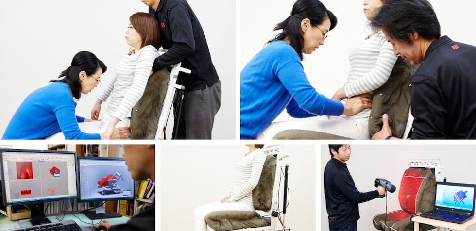 適切に活動を行うことが可能な姿勢を作ることをポジショニングといい、それを座位において行うことをシーティングといいます。ピントを開発したピーエーエスは年間300件を超えるシーティングを行っています。特殊な採型機を用い、人の身体を熟知したセラピストが骨の重みを直接手で感じ、筋肉の緊張や関節の動きなどを確かめながら、解剖学・運動学にのっとった支持面を作り上げていきます。