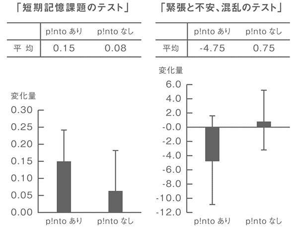 帝京大学・山村豊先生とピントが認知的作業効率の向上に効果があるかどうかを検討するための実験(短期記憶課題と複雑課題)を行ったところ、ピントを使用している人のほうが使用していない人に比べて、作業効率が上昇し、また緊張や不安、混乱という気分についてもピントを使用している人のほうが低減するという結果がでました。この結果から、ピントを使用することによって、緊張や不安を低減し混乱を抑え、適度な覚醒水準を維持することで高度で複雑な認知的作業を促進する効果が期待できると言えます。
