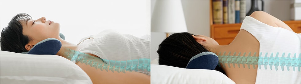 寝ている時も頭の重みで背骨がゆがみ体の負担に。頚や背中の骨を正しい位置に配置し筋肉に負担をかけない寝姿勢を保つには「隙間を埋めることよりも頭の重さを受け止めることが大事」なのです。