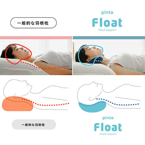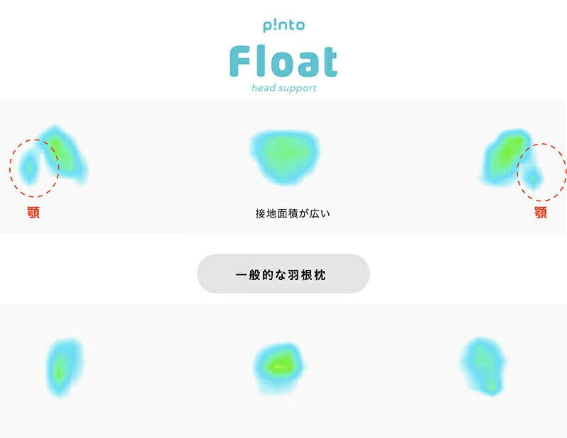 ピント フロートは広い支持面で重たい頭を安定して支えることができるので首や肩の負担を軽くします。寝返りの際は、顎を支えるというこれまでにない発想で快適な睡眠をサポートします。