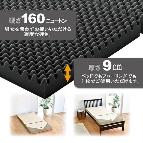 160ニュートンのウレタンマットレスは程よい硬さで男女問わずお使いいただけます。厚さは約9cm。ベッドでもフローリングでも1枚でご使用いただけます。