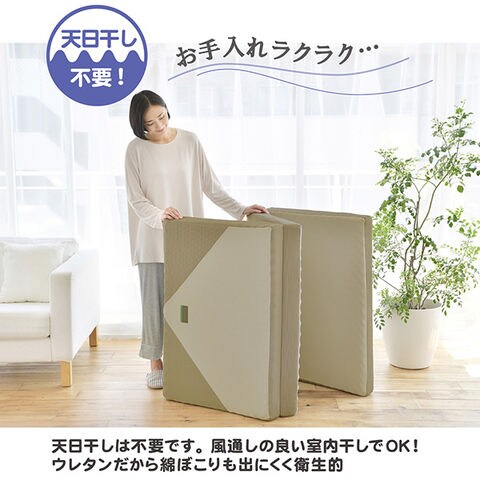 お手入れは風通しの良い場所での室内干しで大丈夫。敷ふとんのように天日干しは不要です。ウレタンなので綿ぼこりも出にくく衛生的です。