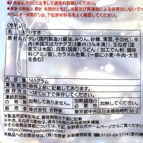 原材料 タレ(醤油、みりん、砂糖、清酒、その他)、牛肉、玉ねぎ、白菜、うどん/加工でん粉、調味料(アミノ酸)、カラメル色素、(一部に小麦・牛肉・大豆を含む)
