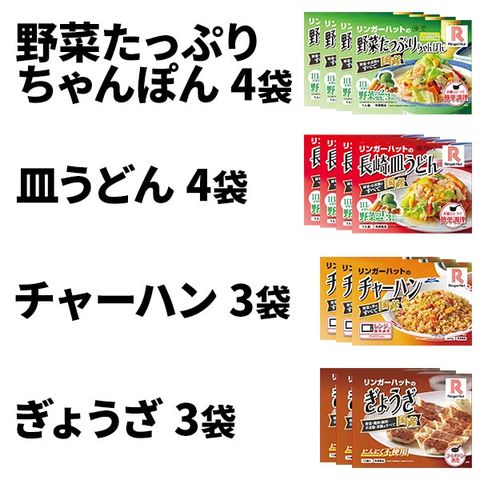 セット内容 野菜たっぷりちゃんぽん×4袋、皿うどん×4袋、チャーハン×3袋、餃子×3袋