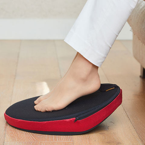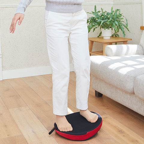 バランスボードのように立った状態で足の関節や体幹を鍛えることもできます。つま先を上げたまま静止すれば、足首からハムストリングにかけてのストレッチにもなります。※手すりやテーブルに掴まるなど、転倒予防をしてご利用ください。