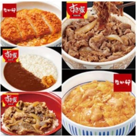 「すき家」と「なか卯」の5種類の味を食べ比べできるお得なセット。