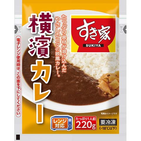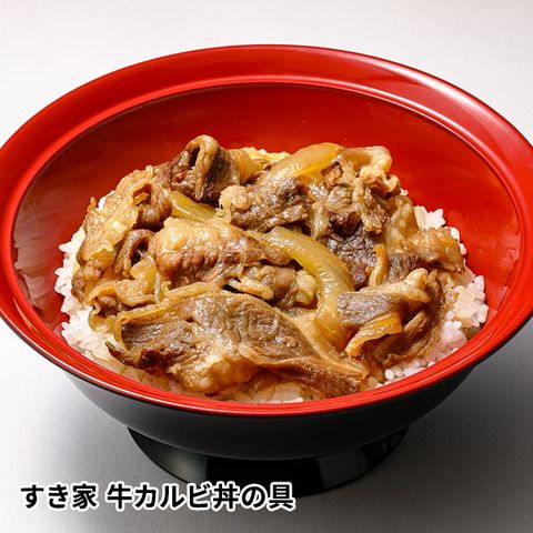 「すき家」の商品は、定番の牛丼の具、牛カルビを特製甘だれで味付けした牛カルビ丼の具、野菜の旨みが溶け込んだ欧風カレーの横濱カレーの3種類。