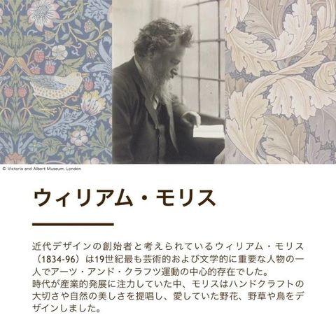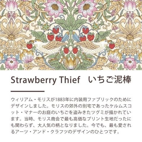 1883年にウィリアム・モリスが手掛けた、内装用ファブリックデザイン「いちご泥棒」。モリスの別宅があったケルムスコット・マナーの庭でよく見かけられた、いちごをついばむ小鳥がモチーフとなった愛らしいデザインで、モリスの代表作の一つです。