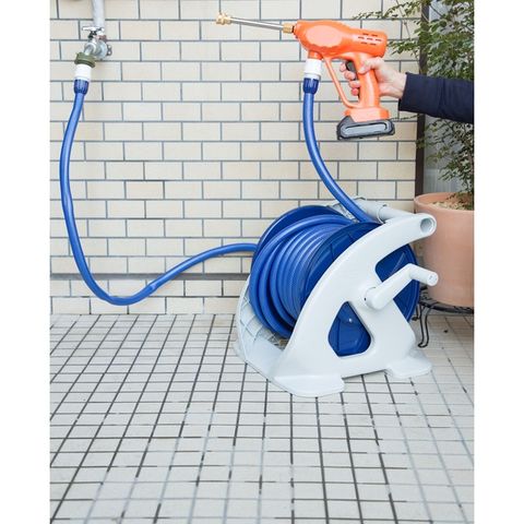 お手持ちのバケツから・ホースリールにつないで・直接水道につないでと3つの使い方ができる3WAYのコードレス式高圧洗浄機。