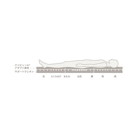 テンピュール(R)素材と形状を変えたサポートウレタンの融合で、理想的な寝姿勢へ。サポートウレタンは3種類の凹凸加工を施し、頭部から足元まで部位に応じて7つにゾーニング。沈み込みすぎないように「お尻」を一番「かため」の形状にし、お尻をかためにすることで浮きがちな「腰」と「太もも」は柔軟にフィットする3つ山構造にしています。