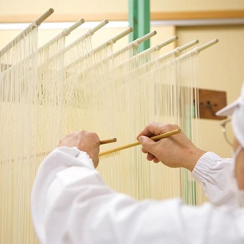 本品も秋田県内のメーカーが手掛けています。職人たちが手で伸ばし、棒に吊るして麺を乾燥させるといった昔ながらの製法で作られています。