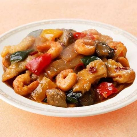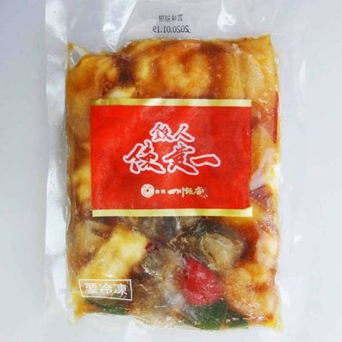 | 原材料 | えび(輸入)、いか、たけのこ、ふくろたけ、ピーマン、黄ピーマン、赤ピーマン、卵白、しょう油、でん粉、ポーク・チキンエキス、ねぎ油、砂糖、清酒、オイスターソース、長ねぎ、しょうが、ラー油、香辛料、ごま油、食塩、大豆油、揚げ油(大豆油)、増粘剤(加工デンプン)、調味料(アミノ酸等)、カラメル色素、酸味料 |