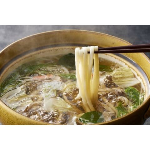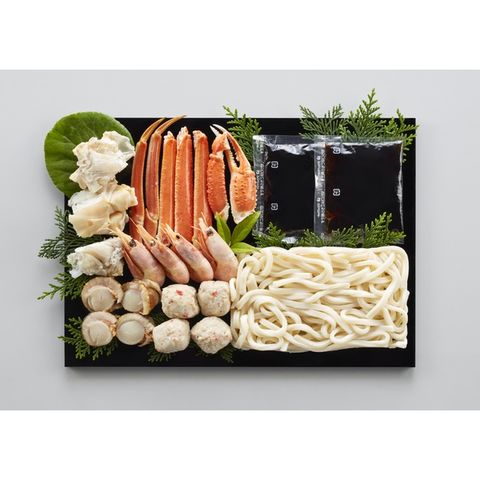 | 原材料 | 鍋具材:ズワイガニ(ロシア産)、ホタテガイ(北海道産)、かに入つみれ(魚肉すり身、豚脂、澱粉、種もの(かに風味蒲鉾、玉ねぎ、かに正肉)、粒状大豆たん白、全卵、魚介エキス、砂糖、食塩、本みりん)、ボイル海老(甘えび(カナダ産)、食塩)、食塩/調味料(アミノ酸等)、紅麹色素、(一部に卵・小麦・かに・えび・豚肉・大豆を含む)うどん:小麦粉(国内製造)、食塩/加工澱粉、(一部に小麦を含む)たれ:醤油(国内製造)、発酵調味液、食塩、砂糖、チキンエキス、還元水飴、みりん、清酒、ビーフエキス、たん白加水分解物、粉末醤油/調味料(アミノ酸等)、(一部に小麦・大豆・鶏肉・牛肉を含む) |