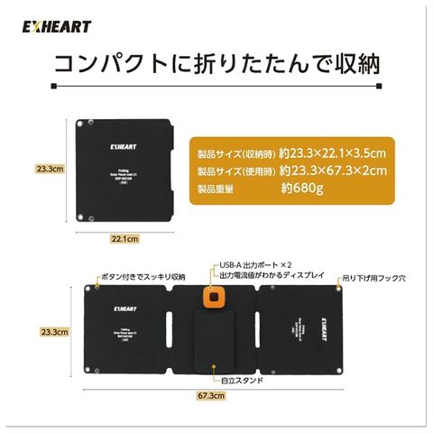 関連キーワード:ハート電機サービス EXHEART エクスハート ソーラーパネル 太陽光パネル コンパクト 折りたたみ 持ち運び スマホ充電 災害対策 災害 防災 キャンプ 旅行 防水 IP65 プレゼント ギフト 誕生日 記念日 クリスマス 父の日 母の日 敬老の日 勤労感謝の日