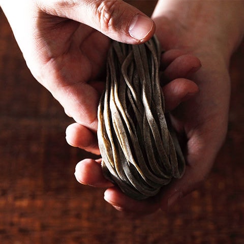 石臼挽きの福井県産自家栽培そば粉を使用し、なまそば独特の弾力のある歯ごたえとそばの風味が際立つ極太麺の八割そばに仕上げました。鰯・鯖・鰹削り節、昆布から出汁をとった自家製つゆがそばの風味を一層引き立てます。パッケージには、越前和紙を使った専用箱や包みには水引をあしらい、大切な方への贈り物に最適です。