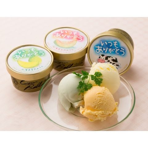 北海道産赤肉、青肉メロンと、北海道産の生乳を使用したバニラの3種類のアイスセットです。感謝の気持ちを込めて「いつもありがとう」のメッセージを入れたカップでお届けします。様々な贈り物に最適です。