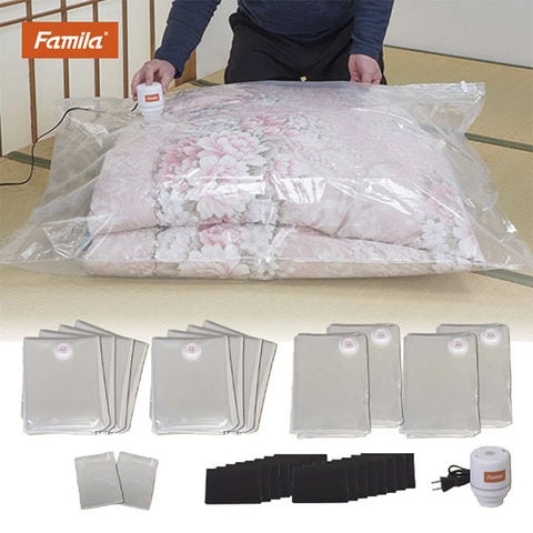 ファミリー・ライフ ファミラ 掃除機のいらない布団圧縮袋 吸引機+圧縮袋 27点セット 1セット(M8枚、L4枚、衣服用2枚、竹炭シート12枚)