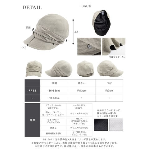 ・頭囲・高さ・つばのサイズ表記は、5mm前後の誤差が生じる場合があります。計測サイズは目安としてお考えください。