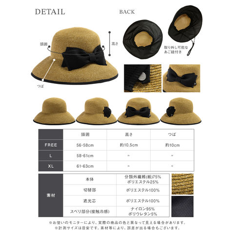 ・高さはモデル着用時の高さを記載しています。 ・頭囲・高さ・つばのサイズ表記は、5mm前後の誤差が生じる場合があります。計測サイズは目安としてお考えください。 ・遮光生地の厚さには多少の差異があり、中にはシャカシャカと音がする場合があります。 ・お取り扱いの前に品質ネームタグの記載内容をご確認ください。 ・ご覧いただくモニターの発色具合によって実物と色が異なって見える場合があります。 ・商品単体の画像が実際の商品と色合いが近いものとなっておりますので、ご参照ください。 ・同商品でも、染色過程で色味が多少変わる場合があります。 ・後頭部のサイズ調節テープで微調節が可能です。 ・取り外し可能なあご紐付きです。 |