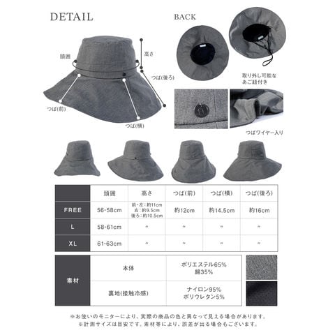 ・高さはモデル着用時の高さを記載しています。 ・頭囲・高さ・つばのサイズ表記は、5mm前後の誤差が生じる場合があります。計測サイズは目安としてお考えください。 ・遮光生地の厚さには多少の差異があり、中にはシャカシャカと音がする場合があります。 ・お取り扱いの前に品質ネームタグの記載内容をご確認ください。 ・ご覧いただくモニターの発色具合によって実物と色が異なって見える場合があります。 ・商品単体の画像が実際の商品と色合いが近いものとなっておりますので、ご参照ください。 ・同商品でも、染色過程で色味が多少変わる場合があります。 ・後頭部のサイズ調節テープで微調節が可能です。 ・取り外し可能なあご紐付きです。 ・つば先ワイヤー入りです。 |