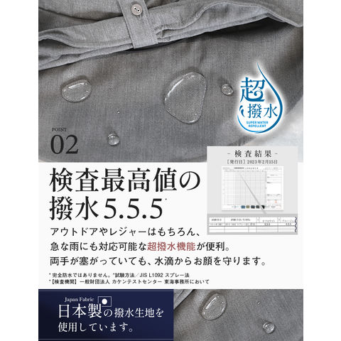 【撥水ブラック・撥水グレー】ポリエステル65%、綿35% 【接触冷感素材(裏地)】ナイロン95%、ポリウレタン5% |