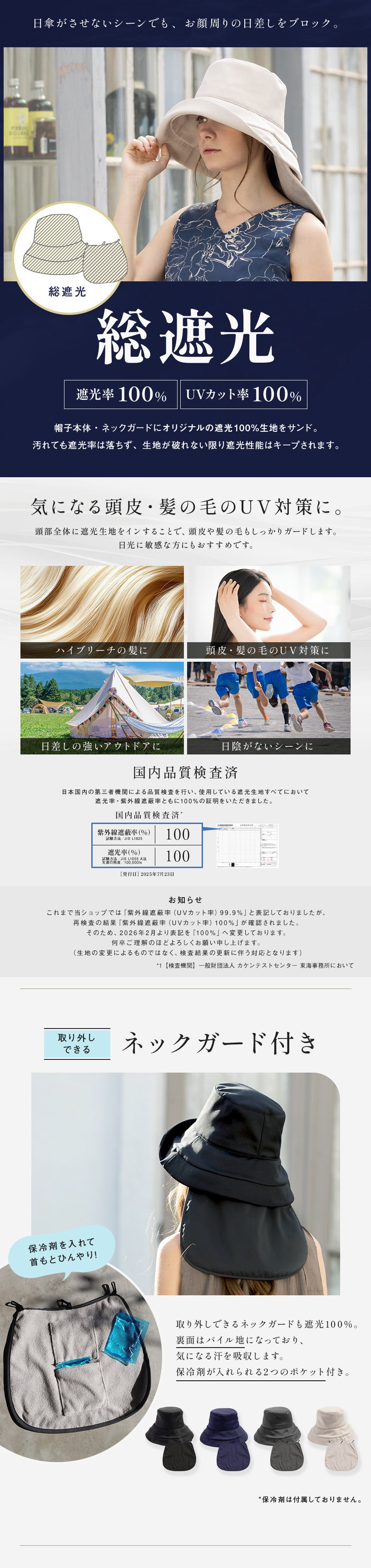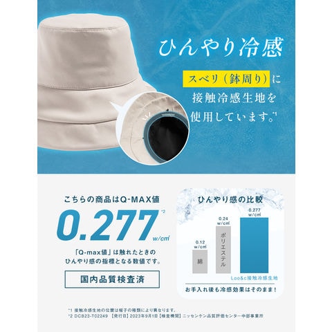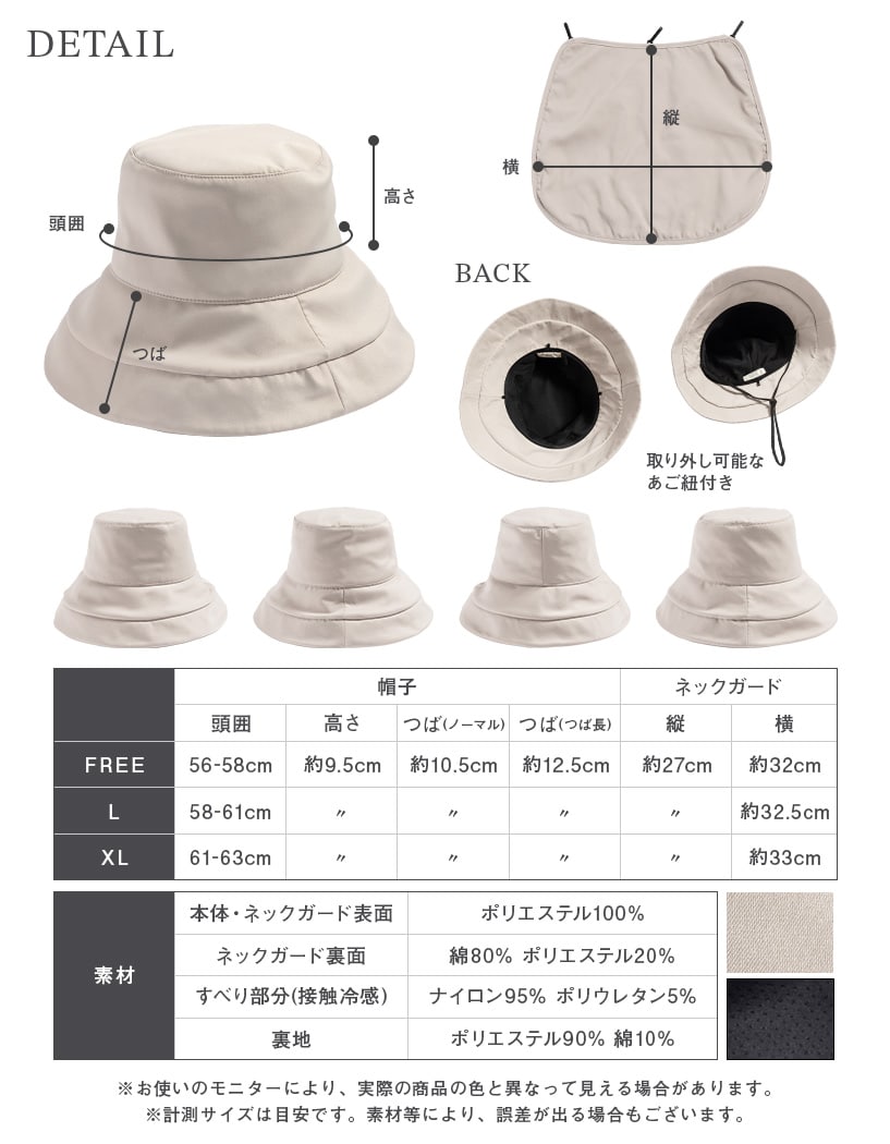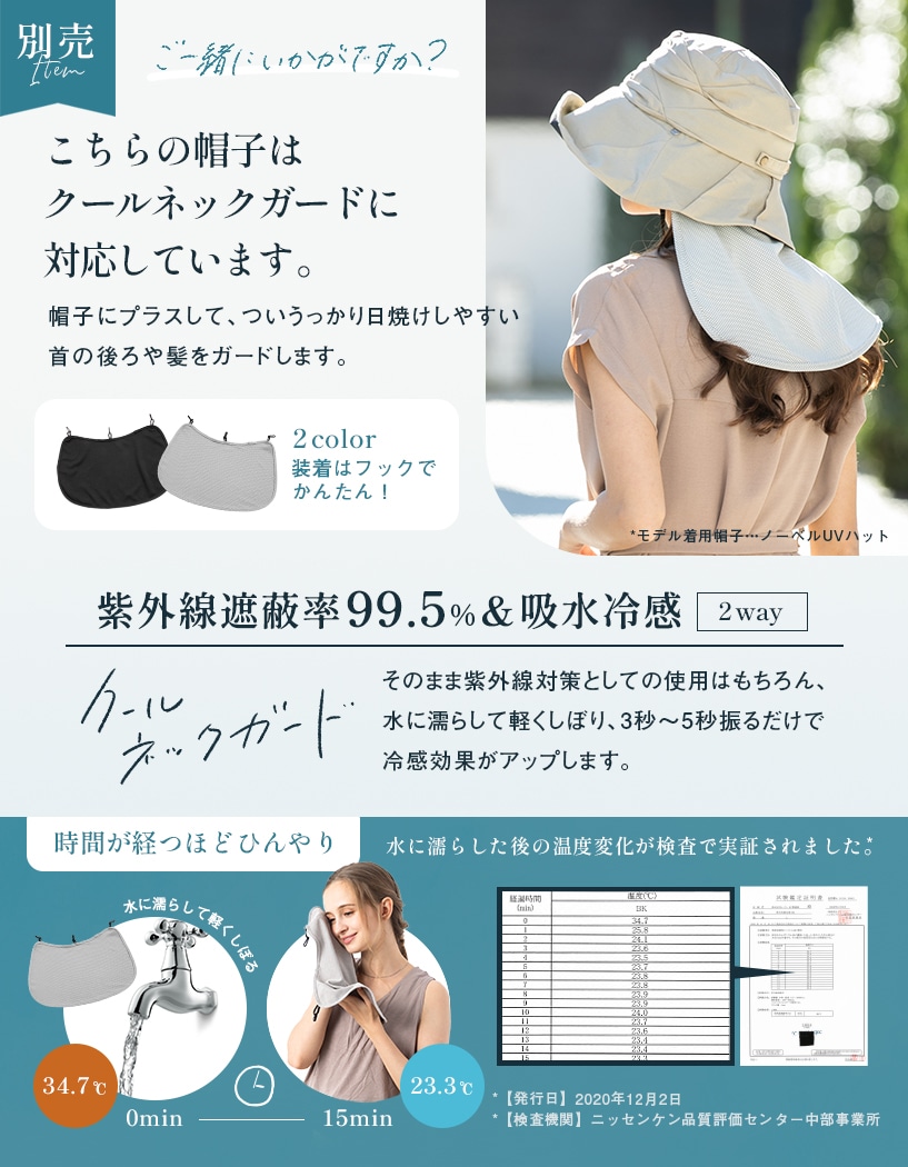 【タレ裏面】綿80%、ポリエステル20% 【接触冷感素材(スベリ部分)】ナイロン95%、ポリウレタン5% 【裏地】ポリエステル90%、綿10% ※タレ=ネックガード |