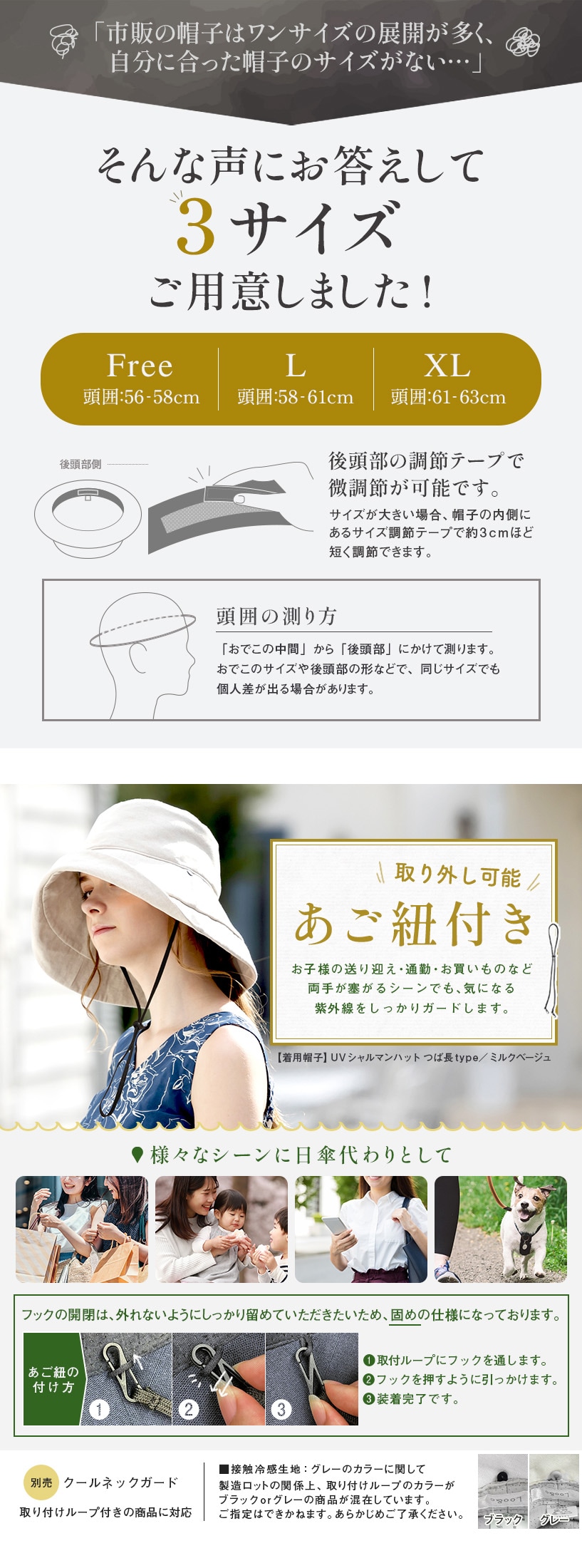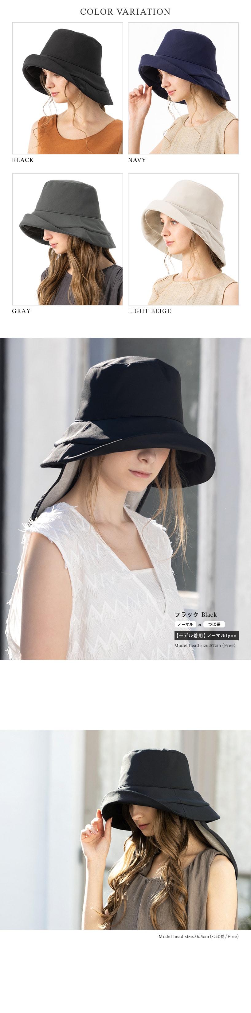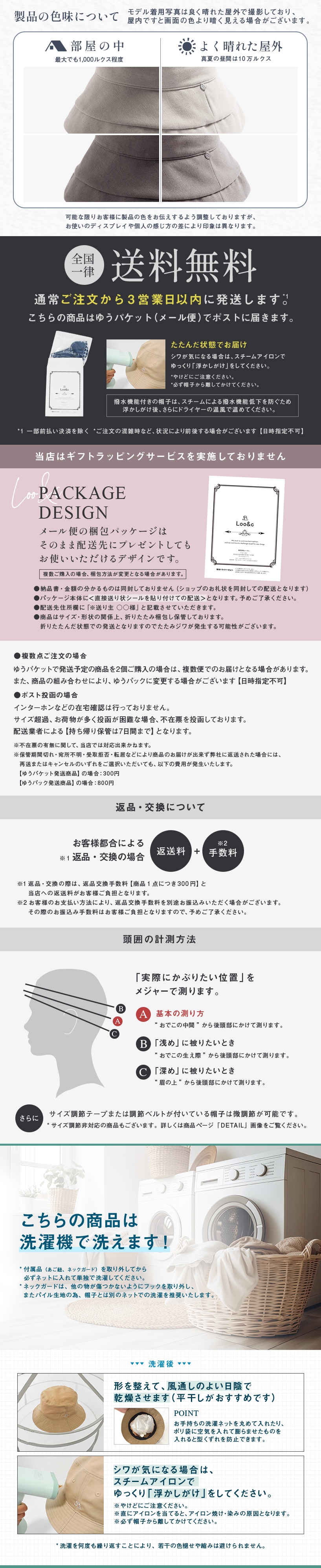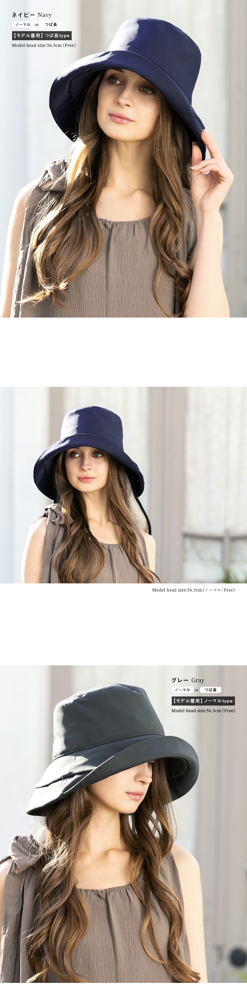 | フリー | 約56-58cm | 約9.5cm | ノーマル約10.5cm/つば長約12.5cm |