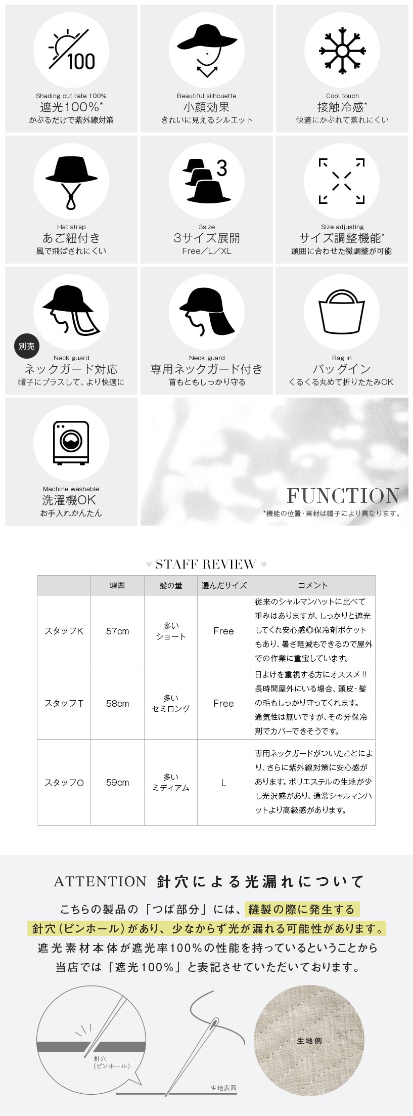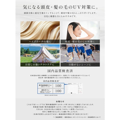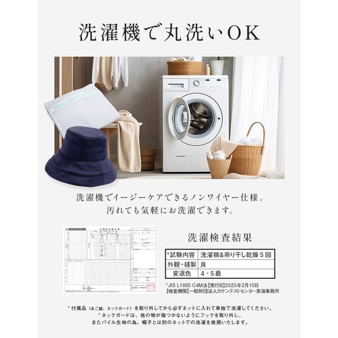 ・頭囲・高さ・つばのサイズ表記は、5mm前後の誤差が生じる場合があります。計測サイズは目安としてお考えください。 ・遮光生地の厚さには多少の差異があり、中にはシャカシャカと音がする場合があります。 ・お取り扱いの前に品質ネームタグの記載内容をご確認ください。 ・ご覧いただくモニターの発色具合によって実物と色が異なって見える場合があります。 ・商品単体の画像が実際の商品と色合いが近いものとなっておりますので、ご参照ください。 ・同商品でも、染色過程で色味が多少変わる場合があります。 ・後頭部のサイズ調節テープで微調節が可能です。 ・取り外し可能なあご紐付きです。 ・取り外し可能なネックガード付きです。 |