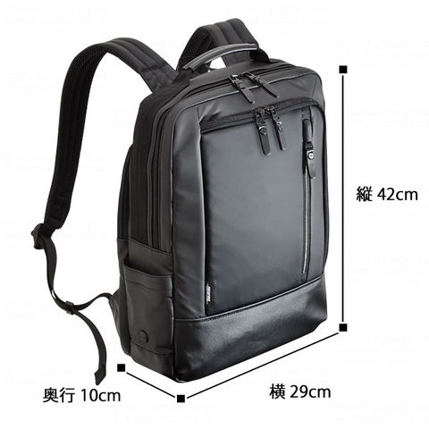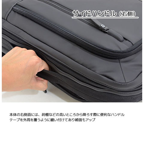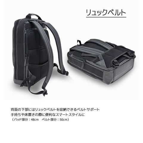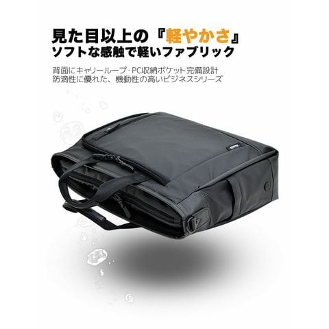見た目以上の『軽やかさ』 ソフトな感触で軽いファブリック。軽量で防滴性に優れた素材を使用し、 背負い系を中心とした機動性の高いビジネスシリーズ。 正面の特徴的なL字ZIPポケットはデザインと使い易さを両立。 全型キャリーバー対応の設計やPC収納ポケット付き。