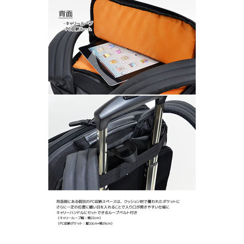 背面: PC収納ルーム、キャリーループ、ベルト収納