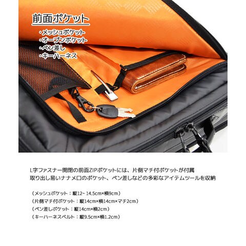 内装 前面ZIPポケット: メッシュポケット、オープンポケット、ペン挿し、キーハーネス