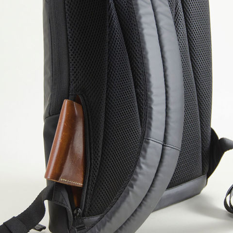 背中に面するファスナーポケットは財布など貴重品の収納に最適。リュックベルト上のファスナーポケットは、小さな小物入れとして便利。