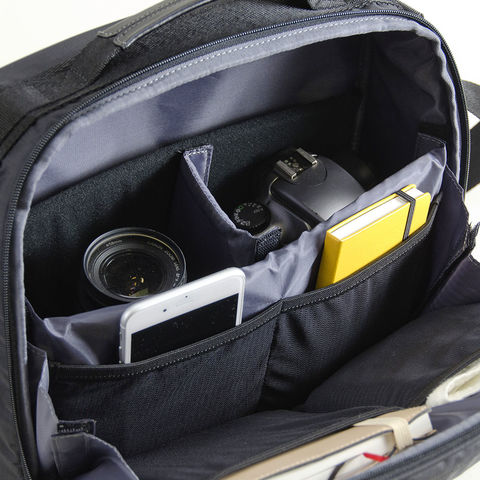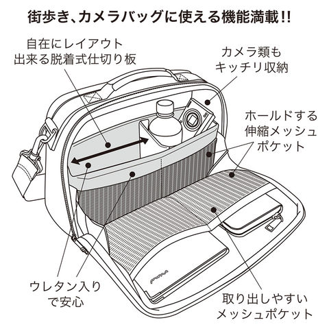 内装 メインルーム:脱着式仕切り板(ウレタン入り)、オープンポケット中(伸縮メッシュ)x2、オープンポケット中(メッシュ)x2