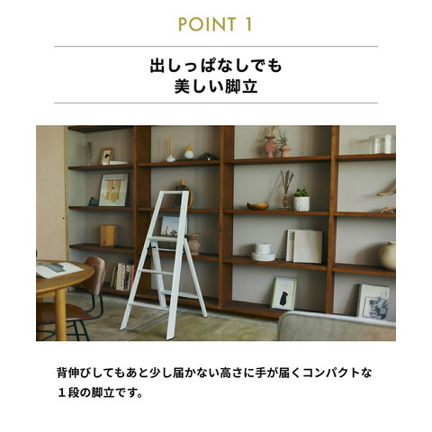 ワンタッチバーを持ち上げて折畳めるので、使用時によくある「手ばさみ」などの不安を払拭。また、シンプルな構造ながら、天板やステップには滑りにくい波形形状を採用。ステップ幅も広く、使うひとを選ばない。 自立するため、佇まいも美しく空間や家具に調和する「隠さなくて良い脚立」