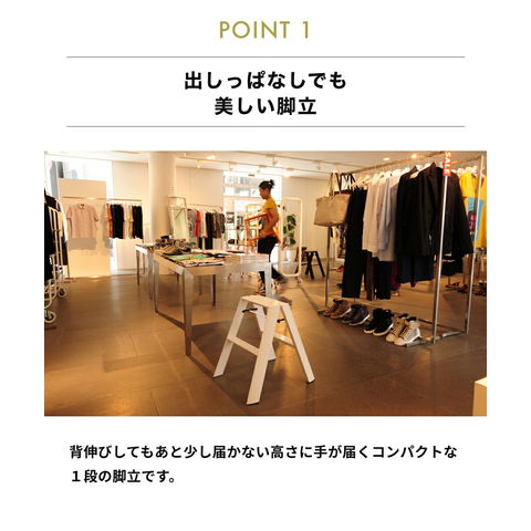 美しいフォルムと機能美で数々のデザイン賞を受賞したルカーノ。スツールとしても使いやすい2ステップ。ワンタッチバーを持ち上げて折畳めるので、使用時によくある「手ばさみ」などの不安を払拭。また、シンプルな構造ながら、天板やステップには滑りにくい波形形状を採用。ステップ幅も広く、使うひとを選ばない。 自立するため、佇まいも美しく空間や家具に調和する「隠さなくて良い脚立」
