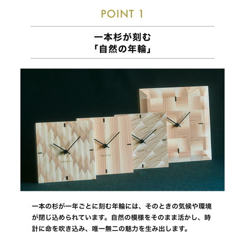 木材として大切に育てられた国産の天然杉の年輪を、木を熟知した職人の経験と感覚でデザインするため、たとえ同じ柄の時計でも、文様の間隔や濃淡が異なり、まさしく『世界に一つだけの時計』が生まれます。