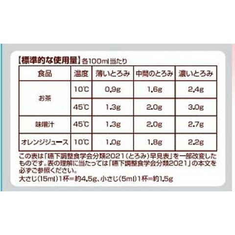 ・トロミの状態は、温度や時間の経過、混ぜ方等によって変化することがあります。トロミを弱くしたい場合は、同じ食品で薄めることで調整することができます。