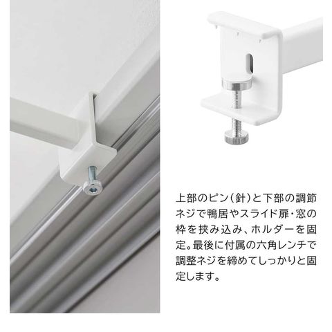 ■取り付け可能な場所 木製の鴨居・スライド扉の枠・窓枠・机・棚 枠の幅:180cm以内 枠の厚さ:1.5~3cm 枠上部の奥行き:1cm以上 枠下部の奥行き:1.5cm以上 *物干しポールは付属しておりません。 |